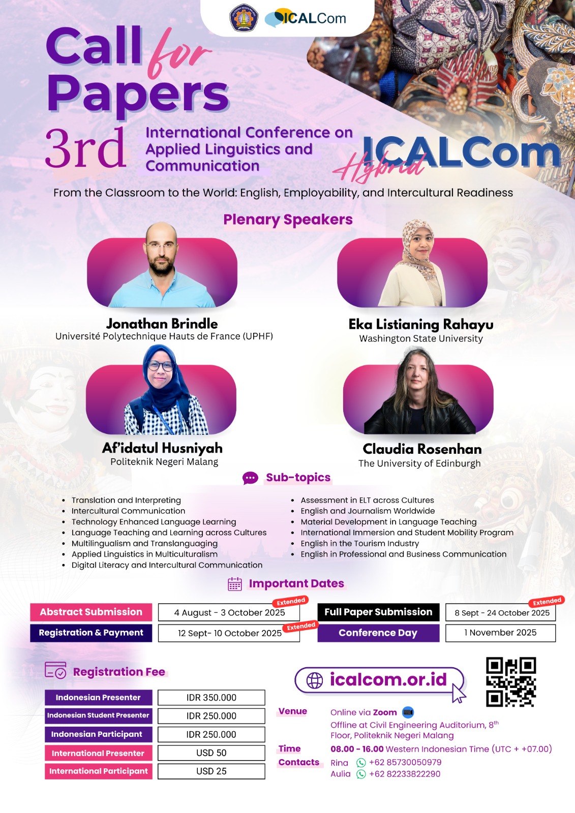 Join us for the ICALCom (International Conference on Applied Linguistics and Communication) on November 1st, 2025. This year’s theme, "From the Classroom to the World: English, Employability, and Intercultural Readiness," focuses on the role of English in enhancing employability, intercultural communication, and technology-driven language learning, while exploring its impact across various fields such as TESOL, multilingualism, journalism, tourism, and business communication. We are honored to host esteemed plenary speakers, including Jonathan Brindle, Eka Listianing Rahayu, Af’idatul Husniyah, and Claudia Rosenhan, who will share their insights and research. Don’t miss this opportunity to engage with leading experts in the field.